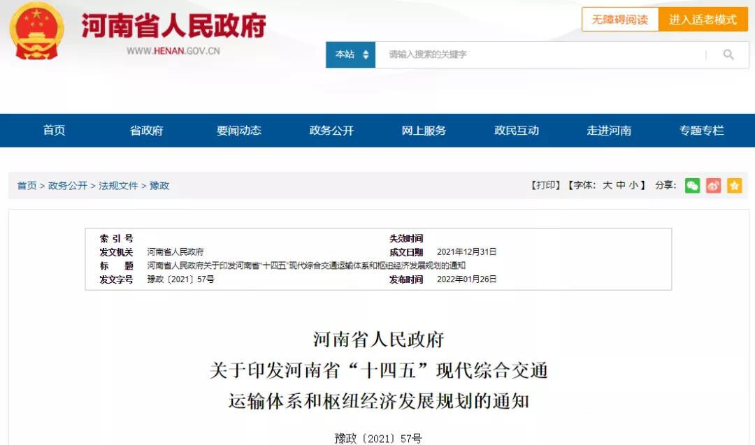 2022年1月26日,《河南省“十四五”现代综合交通运输体系和枢纽经济发展规划》正式对外发布。