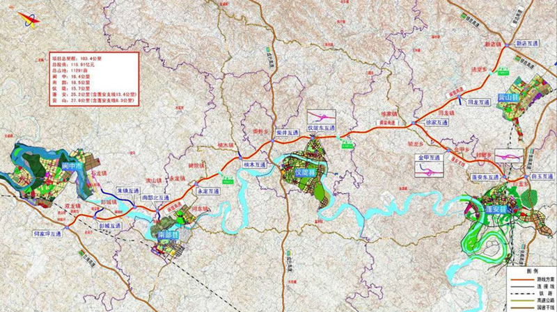 The Langying Expressway starts from the southwest of Langzhong City, Nanchong, and connects with the Nanchong to Guangyuan section of the Lanhai Expressway. It passes through Nanchong County, Yilong County, Peng'an County and Yingshan County, and then connects Yingda Expressway and Zhangnan Expressway via Dazhu. To Chongqing Liangping section. The total length of the line is 105 kilometers, the total investment is about 11.6 billion yuan, and the construction period is 3 years.