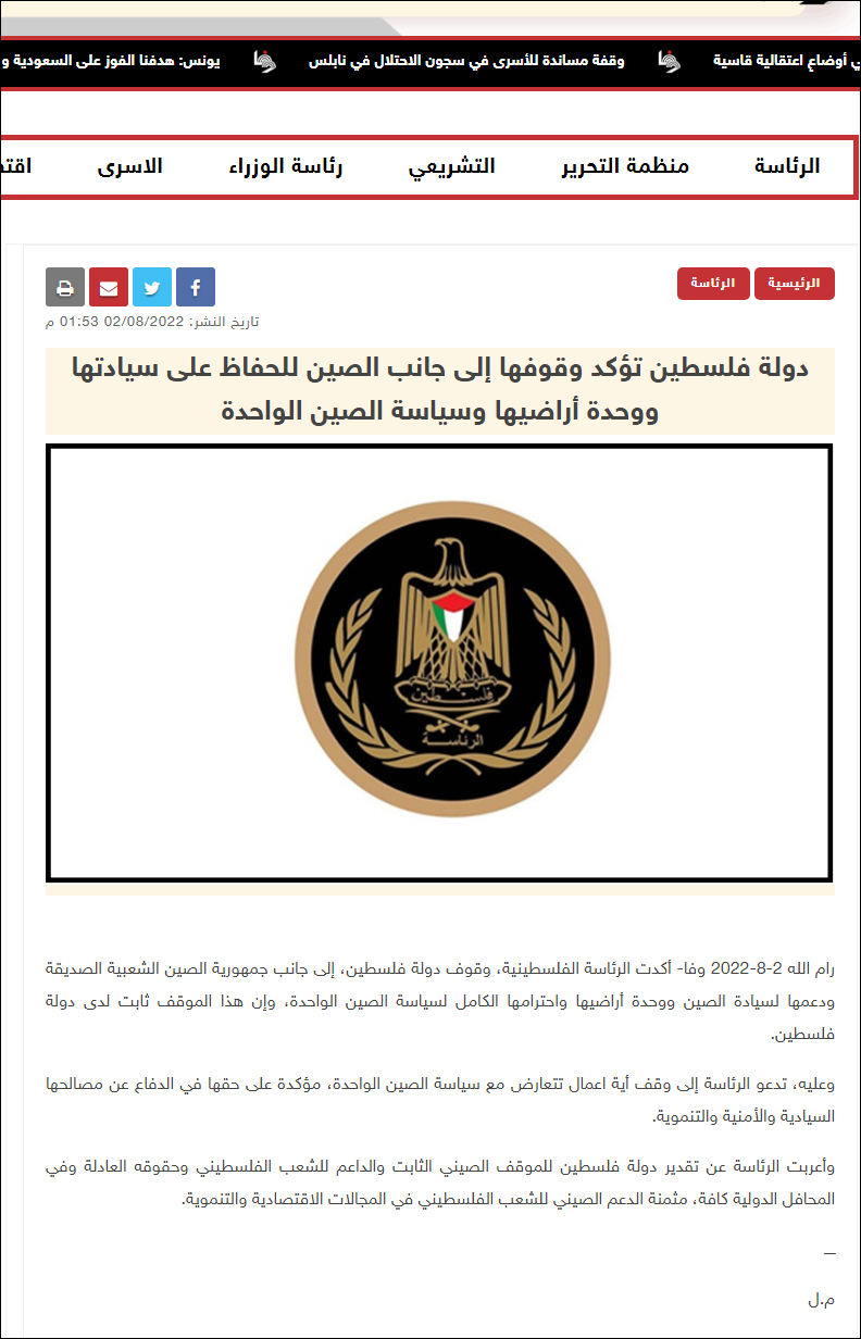 On August 2, 2022, the Palestinian Presidency issued a statement, emphasizing that Palestine stands on the side of friendly China, supports China in safeguarding its sovereignty and territorial integrity, and abides by the one-China principle. This position is firm. Palestine called for an end to any violations of the one-China principle, stressing that China has the right to defend national sovereignty, security and development interests. Editor / Xu Shengpeng