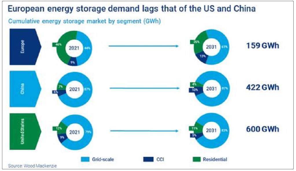 The European market is expected to grow fivefold over the next decade, but the project economy in Europe is holding back expansion, Wood Mackenzie said. Policies may improve project economics. The European Commission's REPowerEU scheme provides for a simplified licensing process for storage and photovoltaic systems and calls for higher renewable energy targets, which in turn will drive demand for energy storage.