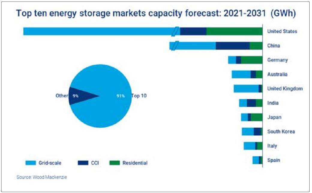 The market is expected to be highly consolidated over the next decade. The top 10 deployment countries are expected to account for 91% of global demand, with grid-scale storage accounting for the largest share of capacity.