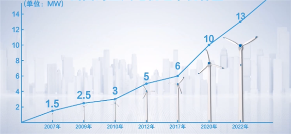 From 2007 to 2022, in 15 years, the single-unit capacity of China's offshore wind turbines jumped from 1.5 MW to more than 15MW in the second half of the year, and the single-unit capacity of our wind turbines has doubled in 15 years. It is increasing at a rate of one megawatt per year.
