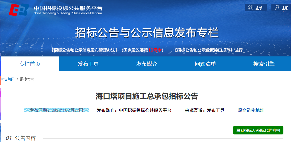 On August 27, 2022, the China Bidding and Bidding Public Service Platform issued a bidding announcement for the general contracting of the construction of the Haikou Tower project.