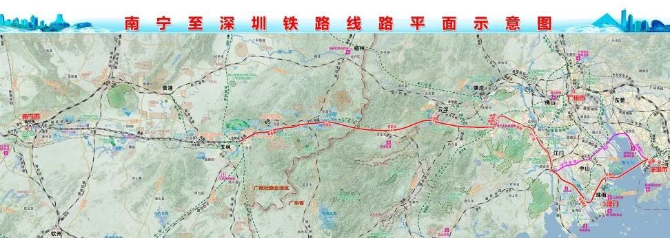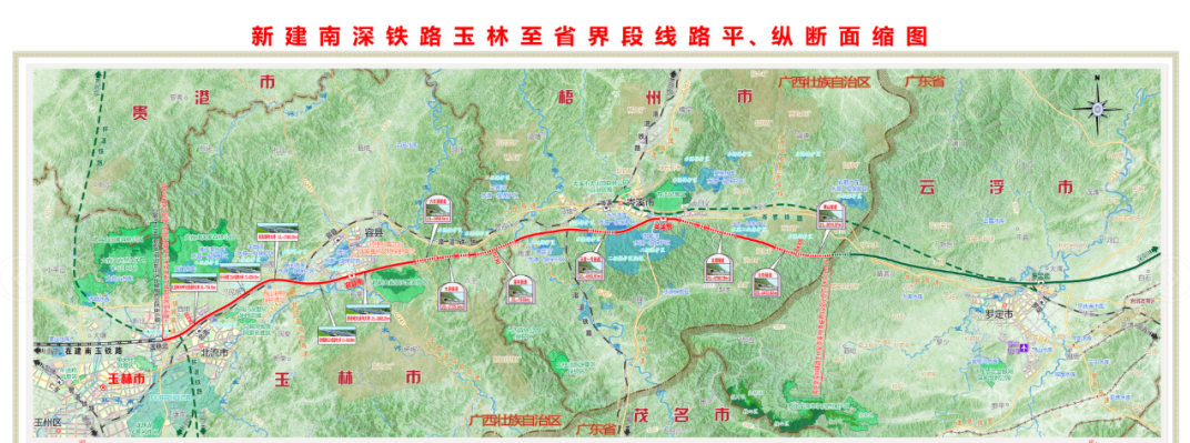 Project scale: The newly built Nanning-Shenzhen Railway Yulin-Cenxi-Guangzhou-Guangdong boundary section leads from the Yulin North Station of the Nanning-Yulin Section Railway, and goes eastward along the Luo-Zhanjiang Railway to Rongxian County. Station, then cross highway G241, cross Cenxi along the south side of Luozhan Railway, set up Cenxi East Station and reach the provincial boundary. The line is about 111 kilometers long and has 3 stations, among which Yulin North Station is under construction, Rongxian South Station and Cenxi East Station are newly built stations.