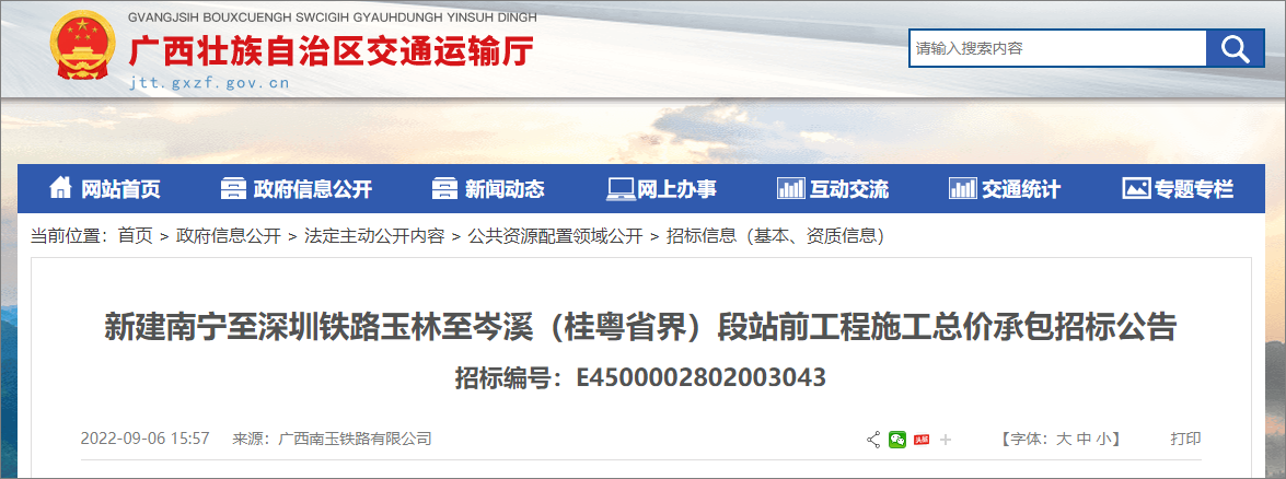 On September 6, 2022, the bidding announcement for the total construction price contract of the new Nanning-Shenzhen railway Yulin-Cenxi-Guangzhou-Guangdong boundary section of the new Nanning-Shenzhen railway was released. The section from Guangxi Yulin to Cenxi, Guangxi-Guangdong Province of the Nanshen high-speed railway is about to enter the full-scale construction stage, with a construction period of 3.5 years.