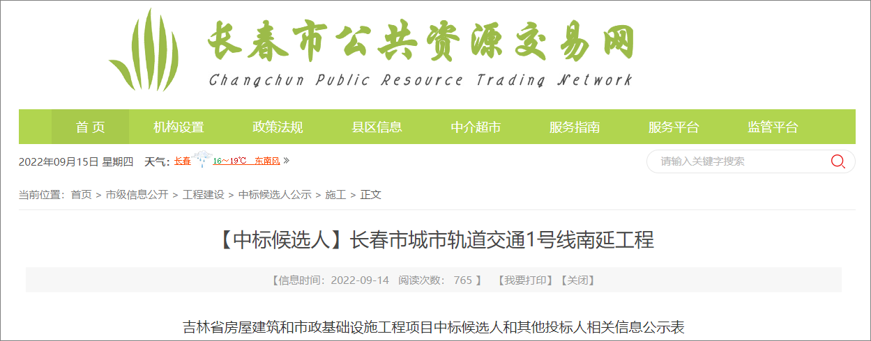 On September 15, 2022, the Changchun Public Resource Trading Network released the announcement of the winning bidders for the Changchun Urban Rail Transit Line 1 South Extension Project. The project was undertaken by Zhongqing Construction Co., Ltd. and China Railway Construction Bridge Engineering Bureau Group Co., Ltd. Won the bid, the project investment is about 3.28 billion yuan.