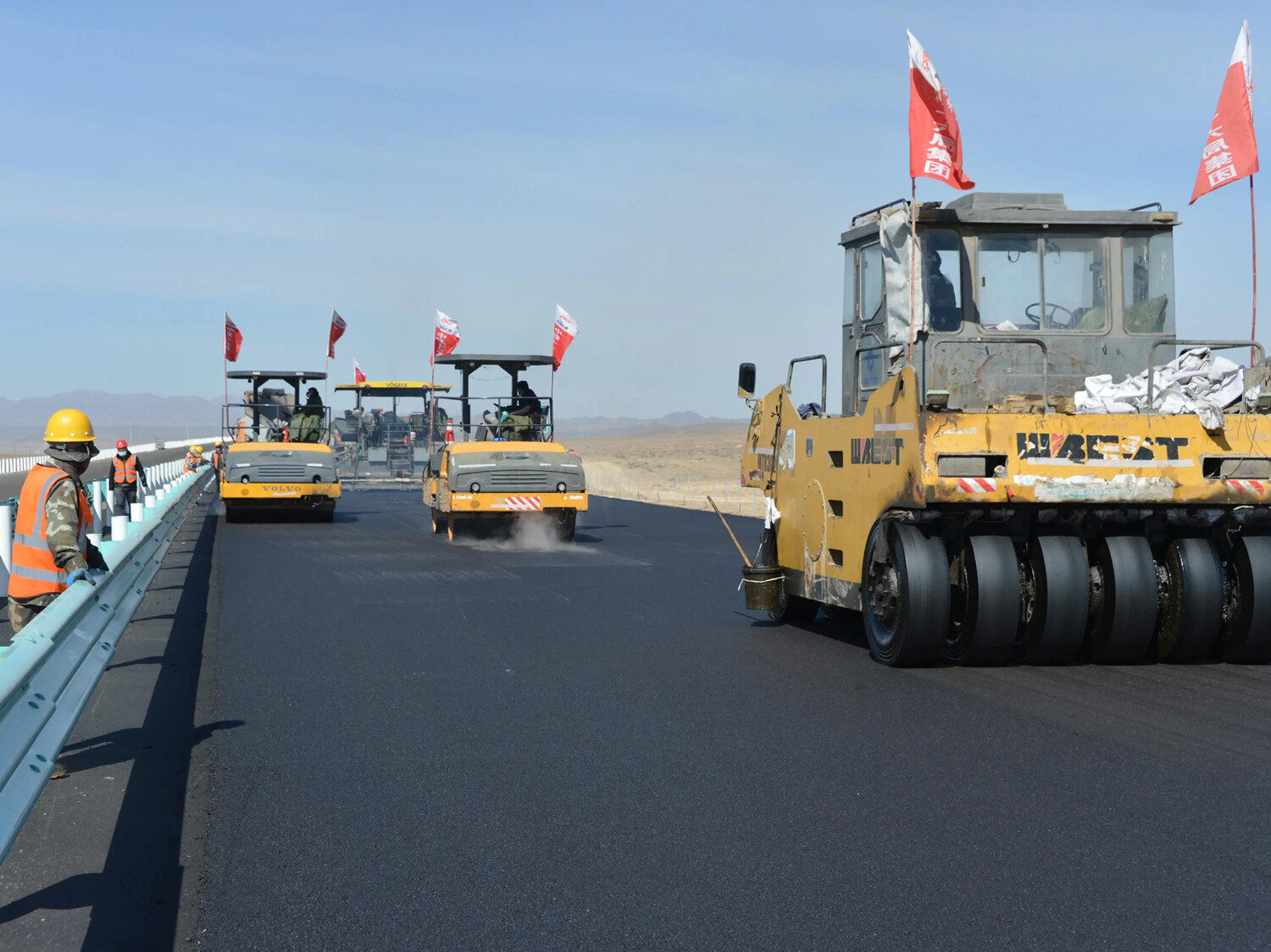 On the vast land of Tiangao, a jade belt like heaven road stretches to the horizon from the long yellow sand and barren Gobi. This is the longest highway project across the desert in the world -- Beijing-New Expressway. At 12 o 'clock on June 30, 2022, as a series of cars drove out of the Yiwu toll station in Xinjiang province, the 515 km section from Wutong Daquan to Mulu of the G7 Beijing-New Highway was officially opened to traffic, marking the smooth operation of the "last kilometer" of the Beijing-New highway. Thus, the whole line of G7 Beijing-New Expressway was completed and opened to traffic. Wang Chaoyang, the person in charge of the first civil construction Contract section of Balikun to Mulei section of Beijing New Expressway of China Railway 15th Bureau Group No.1 Engineering Co., LTD., said: "We are rooted in the Gobi, facing the wind and sand, fighting blizzard, fighting high temperature, and seeing the results of four years of construction today, our heart is excited and surging."
