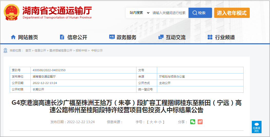 On December 22, 2022, Hunan Provincial Department of Transport released the announcement of the bid winning results of the investors of the franchise project package for the expansion project of G4 Beijing Hong Kong Macao Expressway Changsha Guangfu Zhuzhou Wangshiwan (Zhuting) section bundled with the Chenzhou Guiyang section of Guidong Xintian (Ningyuan) Expressway. The project was won by a consortium of 14 units including China Railway Construction Kunlun Investment Group, with a total investment of about 41.5 billion yuan.