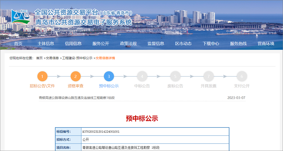 On March 7, 2023, the electronic service system for public resource transactions in Qingdao released the pre-bidding announcement for the addition of Tangshan Road Interchange and Connecting Line Project on Qingyin Expressway. Six units including Municipal Engineering Design and Research Institute Co., Ltd. won the bid, with a total investment of 3.26 billion yuan.