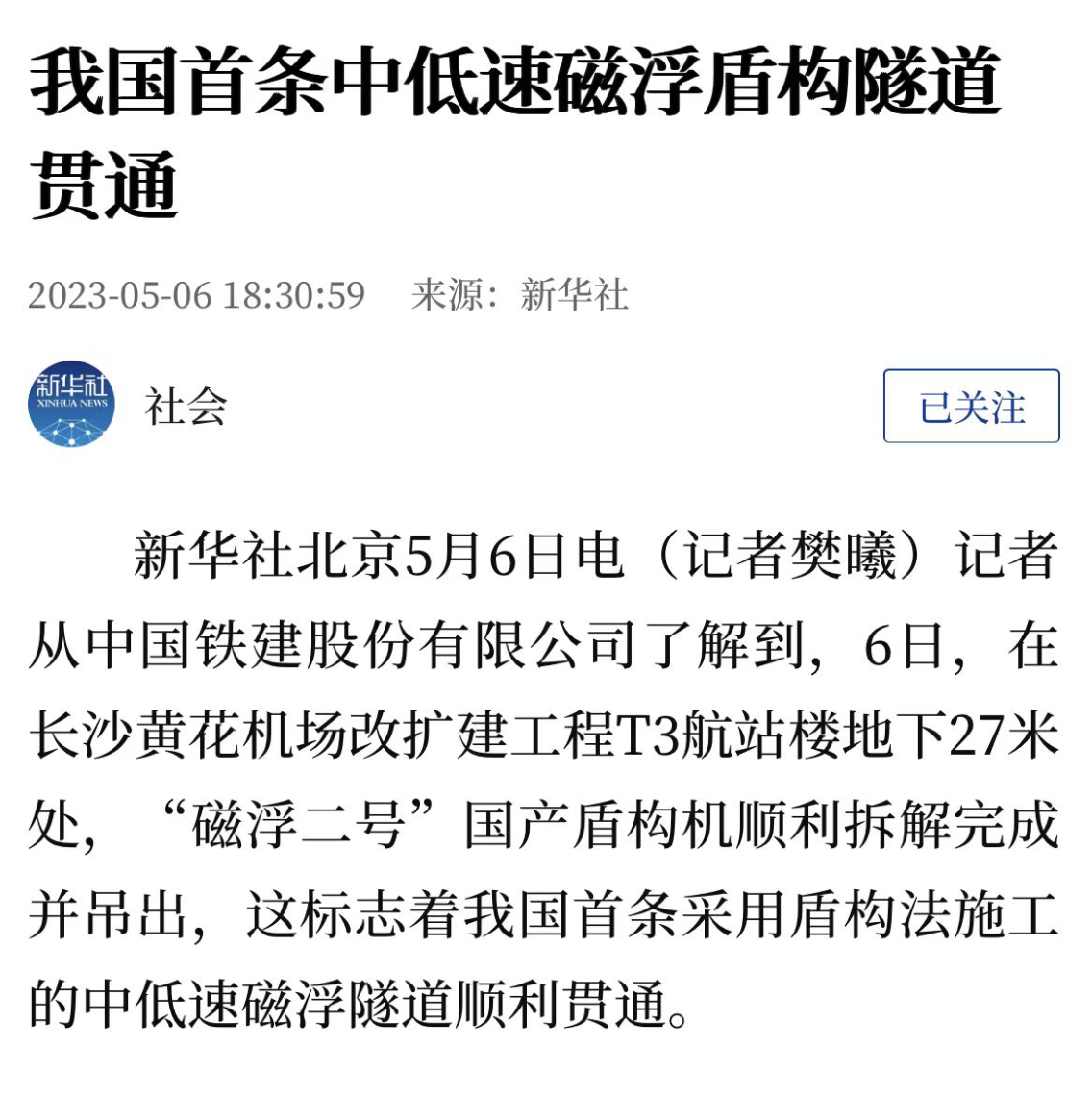 As my country's first medium and low-speed maglev commercial operation demonstration project with complete independent intellectual property rights, the Changsha Maglev Express is a project that China Railway Construction adopts "investment and financing + design and construction general contracting + procurement + R&D + manufacturing + joint commissioning and testing + follow-up comprehensive development "A project constructed in an original mode, connecting Changsha South Railway Station and Changsha Huanghua Airport, with a total length of 18.55 kilometers.