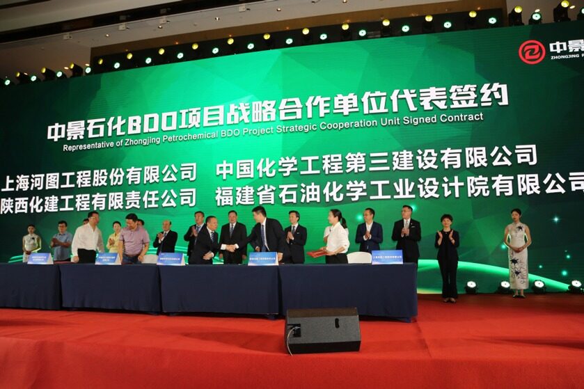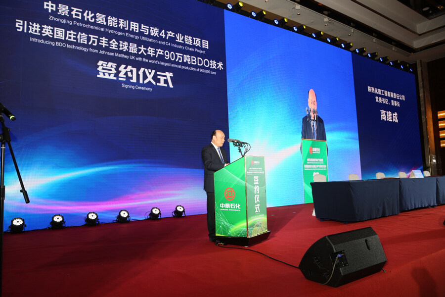 On May 24, the signing ceremony for Zhongjing Petrochemical's hydrogen energy utilization and C4 industrial chain to introduce the world's largest BDO technology with an annual output of 900,000 tons from Johnson Matthey was held in Fuzhou, Fujian. SPCECC Party Secretary and Chairman Gao Jiancheng was invited to attend the signing ceremony and delivered a speech. Deputy General Manager Ding Ruian signed the project strategic cooperation agreement with Zheng Zhaohui, chairman of Zhongjing Petrochemical Co., Ltd. on behalf of SPCECC.