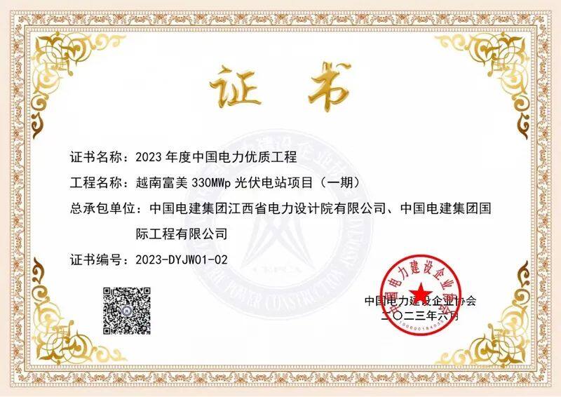 Recently, the evaluation results of 2023 China Power Quality Project were announced, and the Vietnam Phu Mei 330MWp photovoltaic power station project undertaken by Power China won the 2023 China Power Quality Project Award.
