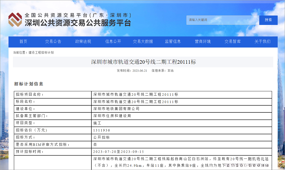 On June 21, 2023, the Shenzhen Public Resource Trading Platform released the bidding plan information for the 2011 bid of Shenzhen Urban Rail Transit Line 20 Phase II Project. The project was constructed by Shenzhen Metro Group Co., Ltd., and the bidder was Shenzhen Metro Group Co., Ltd., with a total investment of 13.119 billion yuan.