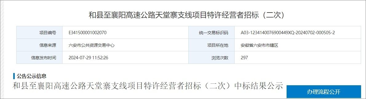 2024年7月29日,六安市公共资源交易中心发布了和县至襄阳高速公路天堂寨支线项目特许经营者招标(二次)中标结果公示,详情如下:
