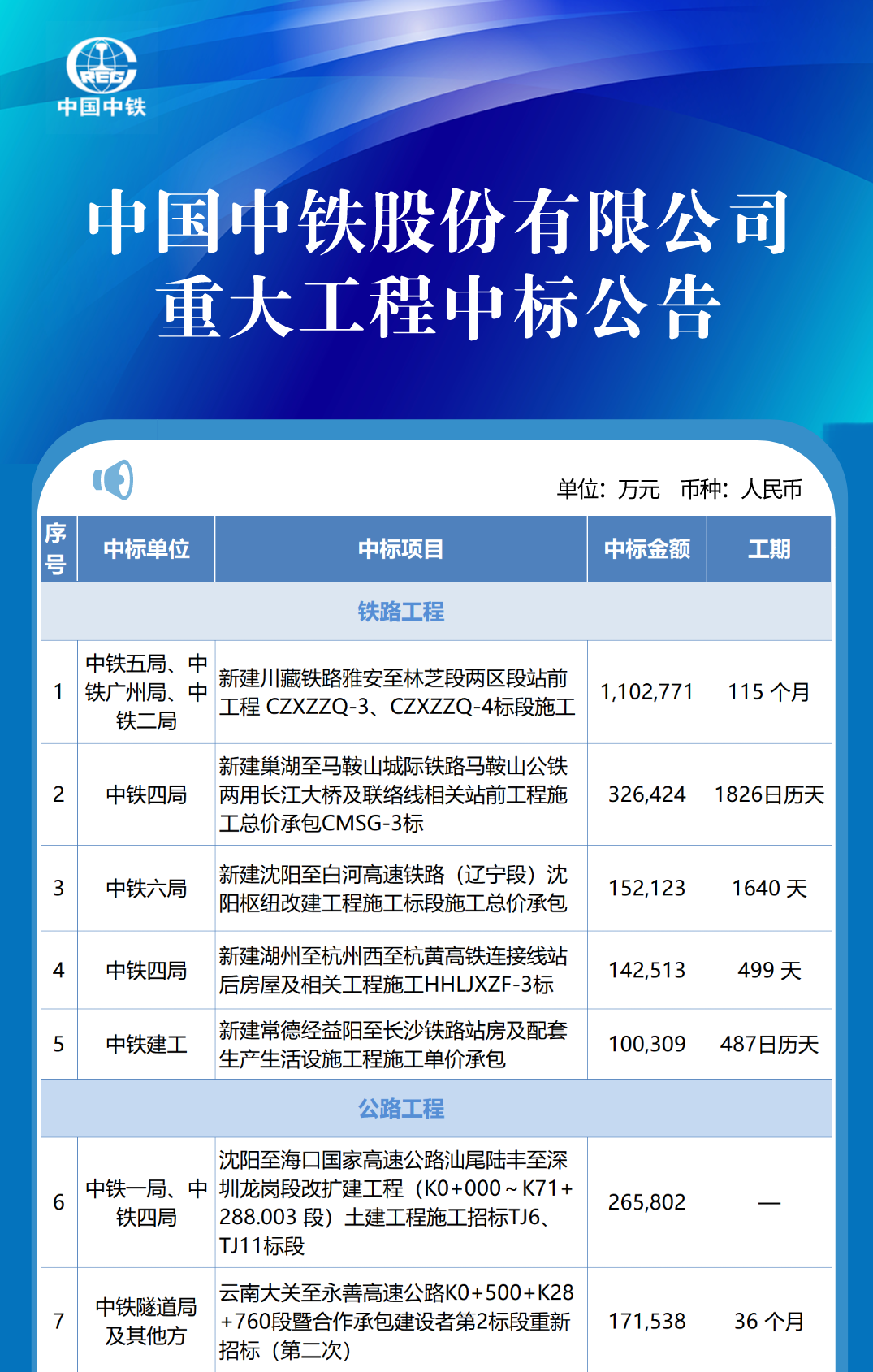 On April 21, 2021, China Railway Group announced that the company has recently won bids for a number of major projects, with a total bid price of approximately RMB 54.847.98 million, accounting for approximately 5.65% of the company's 2020 operating income under the Chinese Accounting Standards. Including 5 railway projects, 2 highway projects and 18 municipal and other projects, of which municipal and other projects accounted for about 59% of the bids, leading both in terms of quantity and amount. Editor/Sang Xiaomei