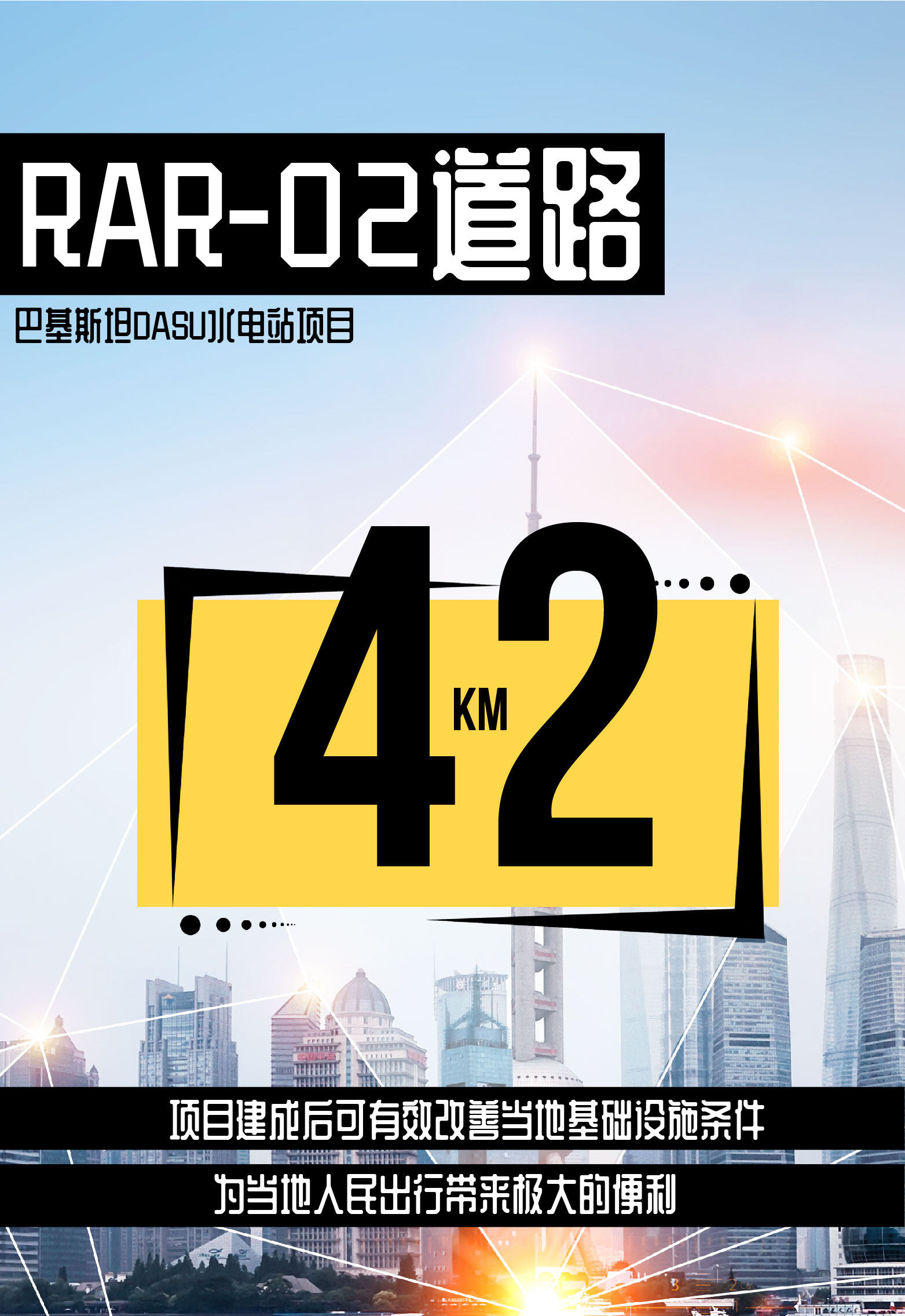 The DASU hydropower station is located in the Indus River Basin, Koshistan District, Khyber Pakhtunkhwa Province, Pakistan. The total installed capacity of the power station is 5,400 MW. It will be implemented in two phases. The first phase installed 6 units, totaling 2,160 MW. The dam is 242 meters high and 570 meters long, with a designed RCC project volume of 4.7 million cubic meters. It is the world's highest RCC dam under construction and one of the most technically difficult, largest total installed capacity, and largest hydropower projects in Pakistan. . The RAR-02 road is about 42 kilometers long. After the project is completed, it can effectively improve the local infrastructure conditions and bring great convenience to local people.