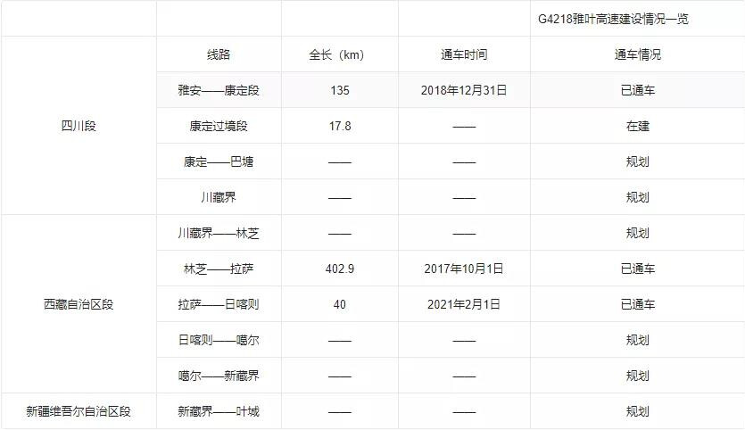 G4218雅叶高速由四川雅安至新疆叶城,主要经过:雅安-天全-泸定-康定-理塘-巴塘-芒康-八宿-林芝-拉萨-日喀则-噶尔-叶城。跨越四川、西藏、新疆三个省。该线路大致沿川藏公路(G318国道)和新藏公路(G219国道)一线。