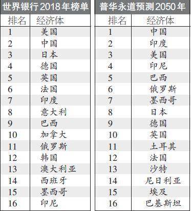 过去十几年,针对全球主要经济体,有不少相对权威的机构进行过排名预测。2017年2月,按照购买力平价,普华永道发布全球32个最大经济体的预测报告《2050年的世界》称,在科技继续推动生产力的作用下,2016至2050年期间,全球GDP将累积增长130%,远超人口增幅。新兴市场“E7”(中国、印度、印尼、俄罗斯、巴西、墨西哥和土耳其)的平均增速将约为发达经济体(G7)的两倍,因此到2050年,全球7大经济体将依次是中国、印度、美国、印尼、巴西、俄罗斯和墨西哥。