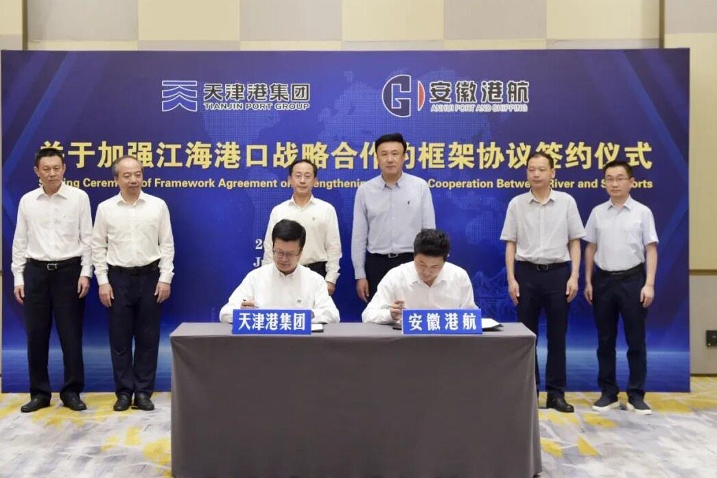 天津港集团党委书记、董事长褚斌,安徽省港航集团有限公司党委书记、董事长丁庆领出席签约仪式。天津港集团副总裁罗勋杰,安徽省港航集团有限公司党委委员、副总经理李祎茂代表双方共同签署《关于加强江海港口战略合作框架协议》。