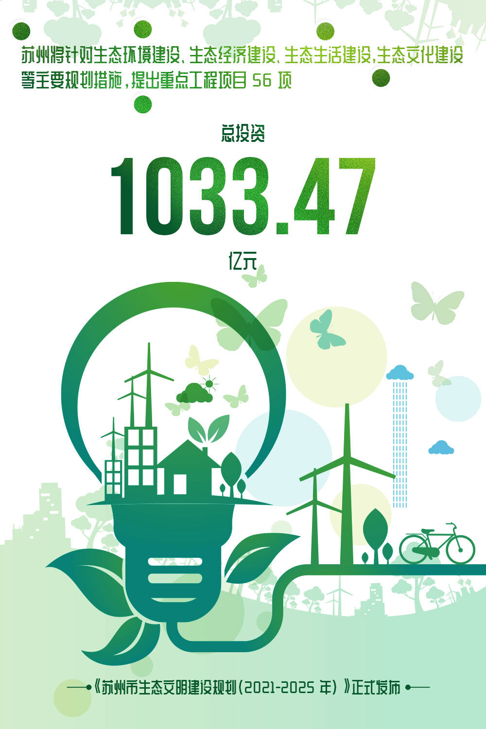 近日,见道网记者获悉,作为新时代建设绿色宜居城市的根本要求,《苏州市生态文明建设规划(2021-2025 年)》正式发布,苏州将针对生态环境建设、生态经济建设、生态生活建设、生态文化建设等主要规划措施,提出重点工程项目 56 项,总投资 1033.47 亿元。