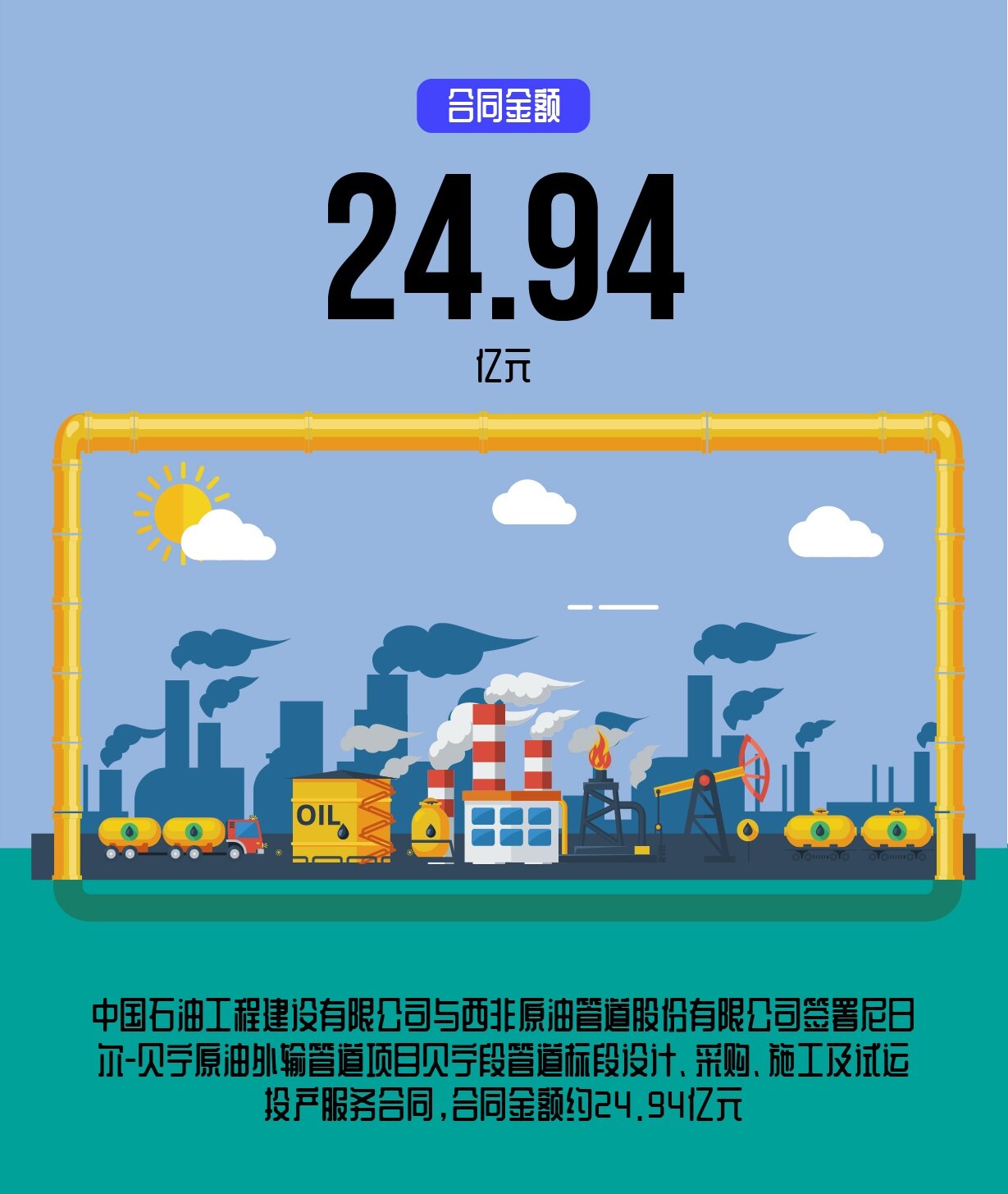 见道网从中油工程获悉,近日,中国石油工程建设有限公司与西非原油管道(贝宁)股份有限公司签署尼日尔-贝宁原油外输管道项目贝宁段管道标段设计、采购、施工及试运投产服务合同,合同金额约24.94亿元人民币,合同工期为42个月(含12个月质保期)。