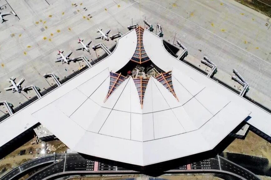 仅航站楼屋面施工部分就有3708个高空焊接节点200余名工人历时4个月完成施工,期间使用焊材200吨,焊丝长度可绕地球赤道1圈。