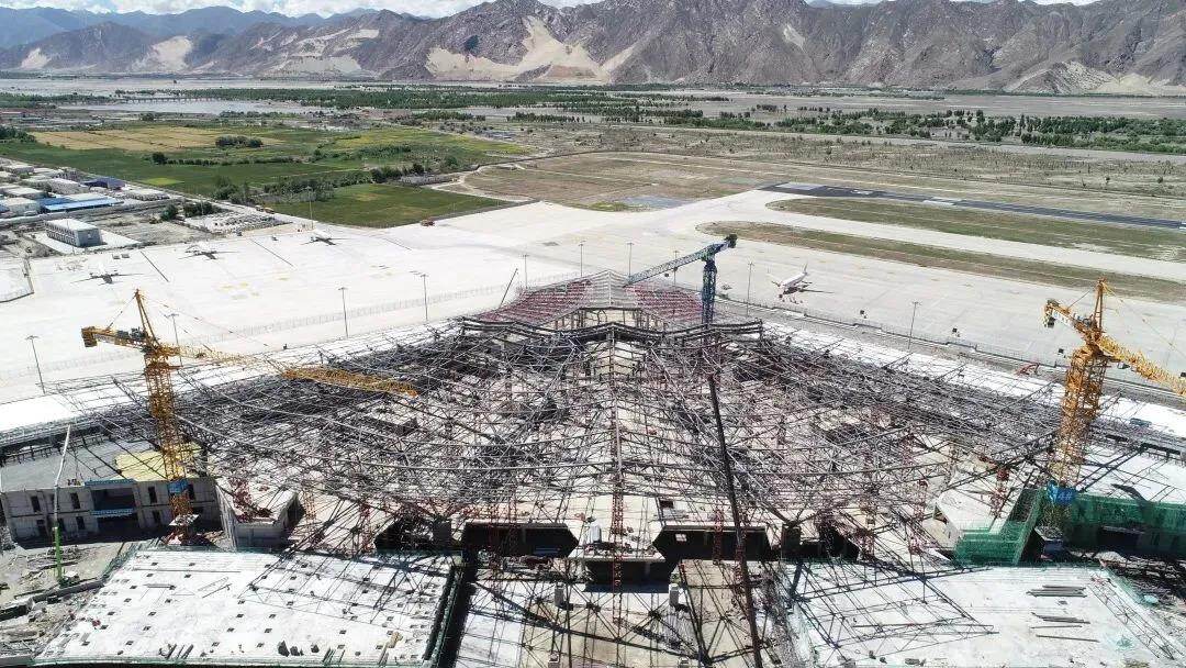 拉萨贡嘎国际机场T3航站楼总建筑面积约8.8万平方米其中钢结构施工面积达5.6万平米共使用钢构件1万吨。