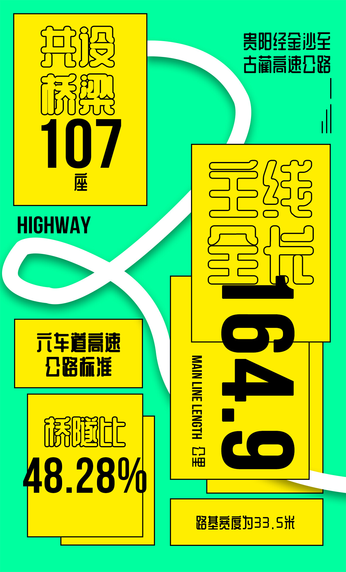 贵阳经金沙至古蔺(黔川界)高速公路项目主线全长164.895公里,桥隧比48.28%。其中贵阳境全长67.373公里,毕节境全长约97.521公里。采用设计速度100km/h、六车道高速公路标准,路基宽度为33.5米。沥青混凝土路面。全线共设桥梁107座,总长59574.8米。其中特大桥10座,共长15351.5米;大桥91座,共长43851.8米;中桥5座,长343.5米,项目桥梁占路线总长的36.129%。全线共设隧道17座,总长20032.5米,其中长隧道10座,长16655.75米;中隧道2座,长1390米;短隧道5座,长1987米,隧道占路线总长的12.15%。全线共设互通式立交20处,其中枢纽互通7处;服务区4处、管理分中心1处、匝道收费站13处,主线收费站1处;全线连接线共有8条,总长65.4公里,互通连接线为12米宽的二级公路技术标准。