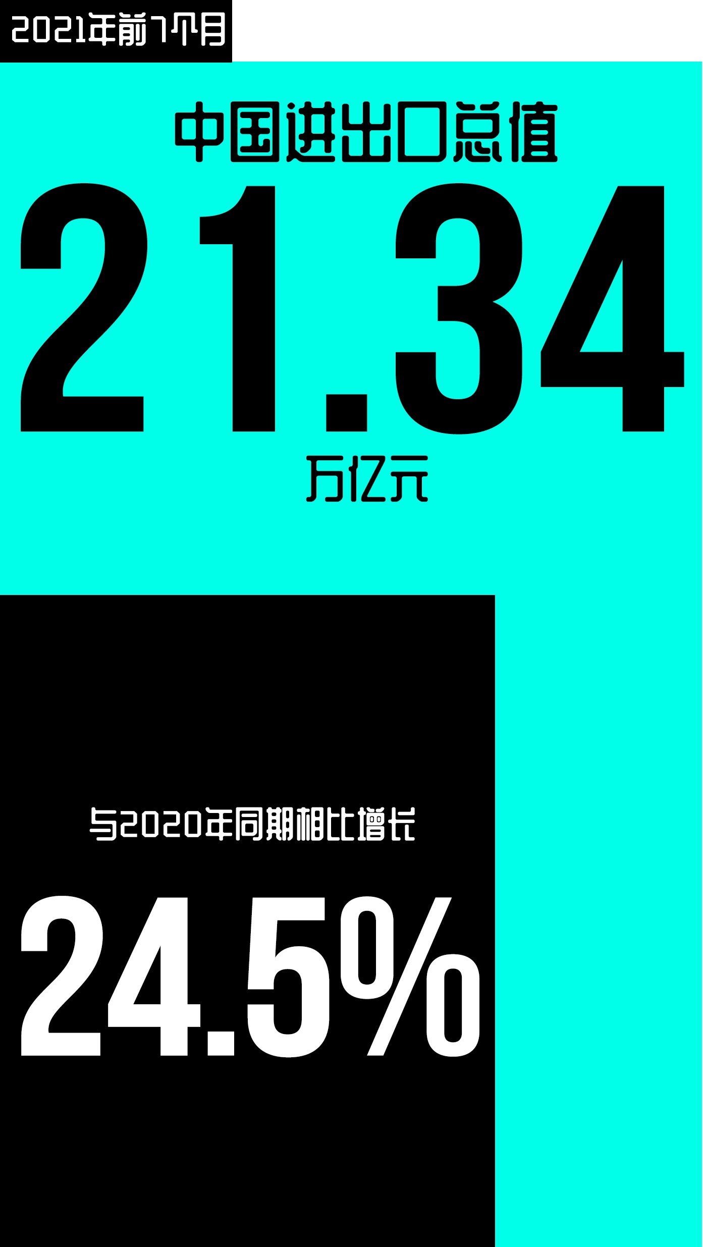 2021年8月7日,根据海关总署发布的数据,2021年前7个月,中国进出口总值21.34万亿元人民币,与2020年同期相比增长24.5%。其中,出口11.66万亿元,同比增长24.5%,比2019年同期增长23%;进口9.68万亿元,同比增长24.4%,比2019年同期增长21.4%。