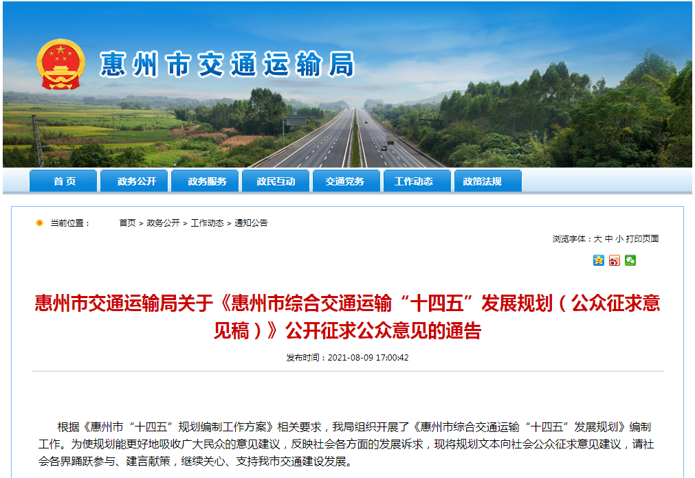 Speed up the construction of the artery of economic development, and implement the goal of building a strong transportation country. On August 9, the Huizhou Municipal Transportation Bureau issued a notice to solicit public opinions on the "Fourteenth Five-Year Plan for Comprehensive Transportation in Huizhou (Draft for Public Comment)".