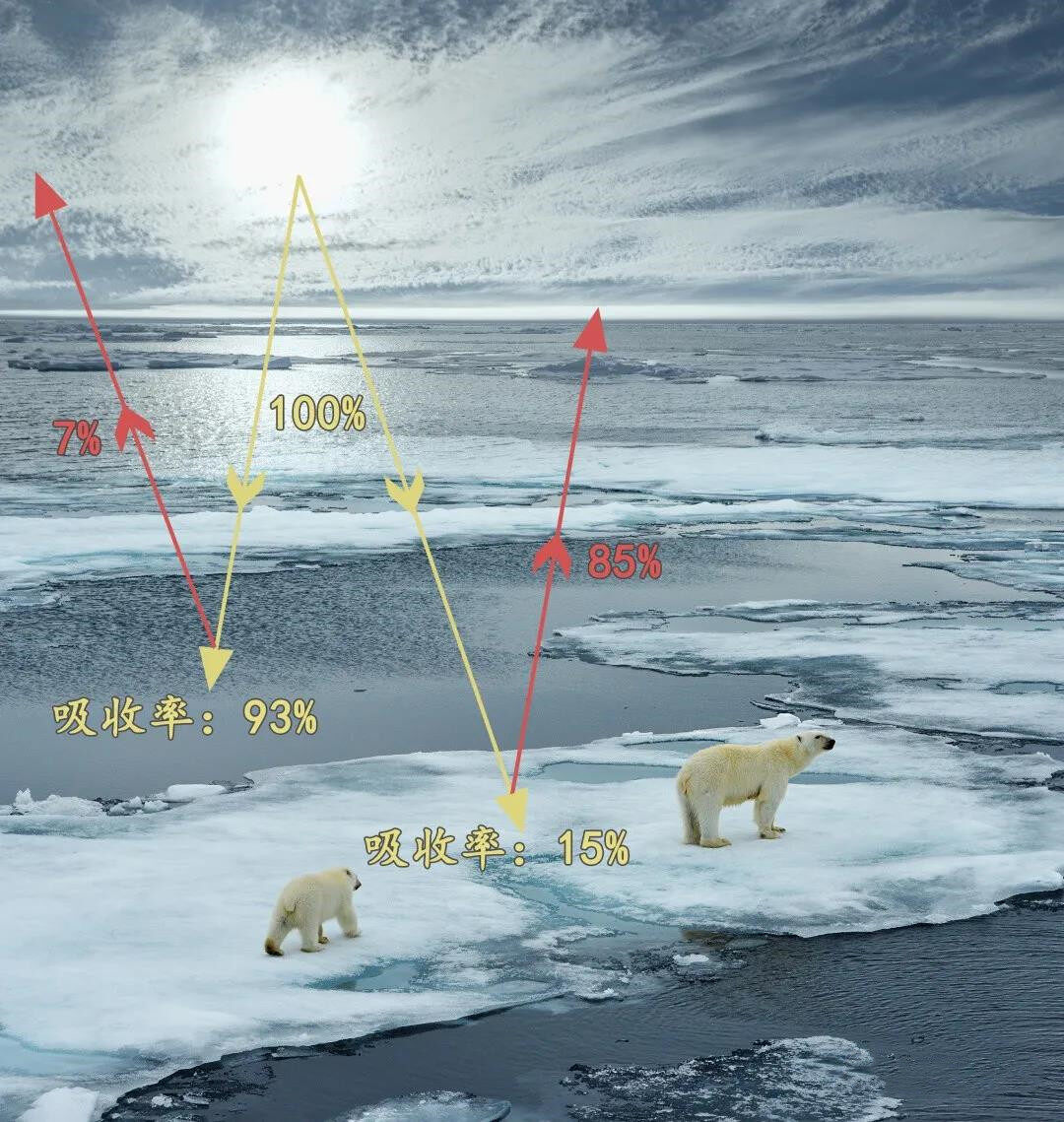 冰盖,海冰,雪面的反射率都远高于水面和陆地,海冰的消融扩大了高吸收率区域的面积,造成持续的变暖循环