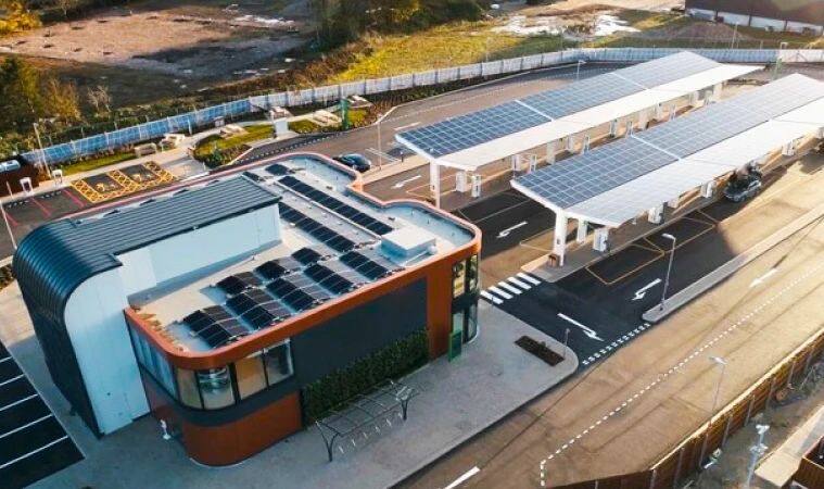 英国光储充一体化项目,系统配置1.75MW光伏系统、5MW/5MWh储能系统和7kW-350kW充电桩,通过光伏和储能联合出力,可同时满足36辆电动汽车现场充电。