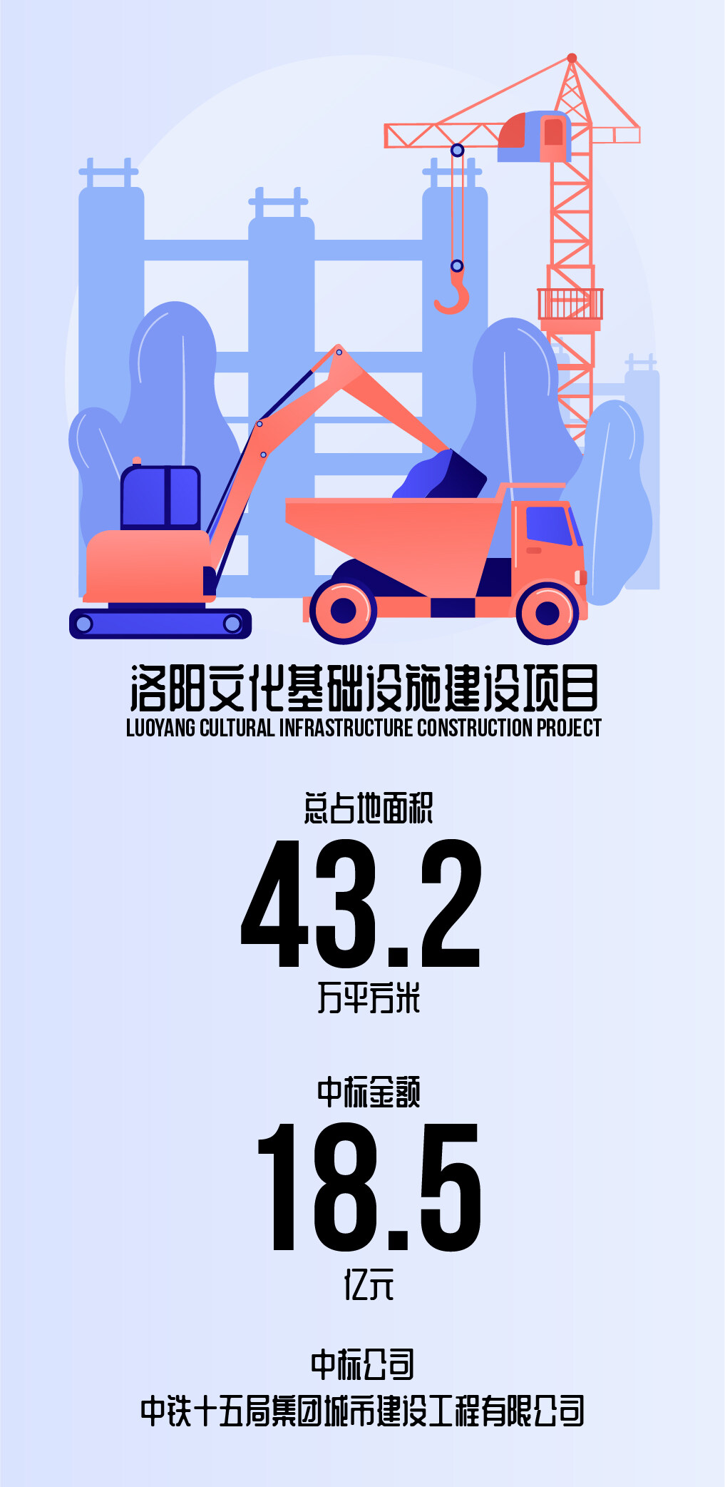 2021年8月18日,中铁十五局喜中洛阳文化基础设施建设项目,项目总占地面积432293.33㎡,总投资18.5亿元。