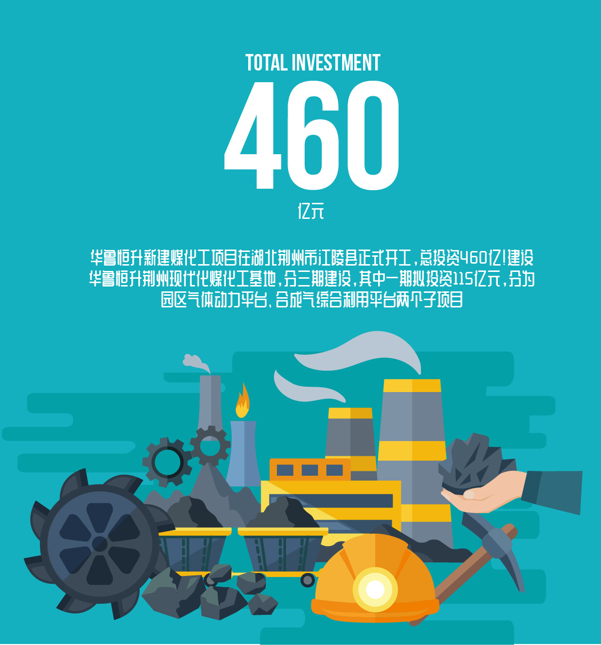 华鲁恒升(荆州)有限公司合成气综合利用项目/园区气体动力平台项目计划投资460亿元建设华鲁恒升荆州现代化煤化工基地,分三期建设:一期拟投资115亿元,占地2400余亩,分为园区气体动力平台、合成气综合利用平台两个子项目,主要以煤炭高效清洁利用生产技术建设年产百万吨醋酸、70万吨尿素、30玩万吨熔融液尿、10万吨密胺树脂、15万吨DMF,1.36万吨硫磺,15万吨混甲胺等;二、三期项目以一期项目为平台,生产高端化工新材料、精细化工和氢能产品。
