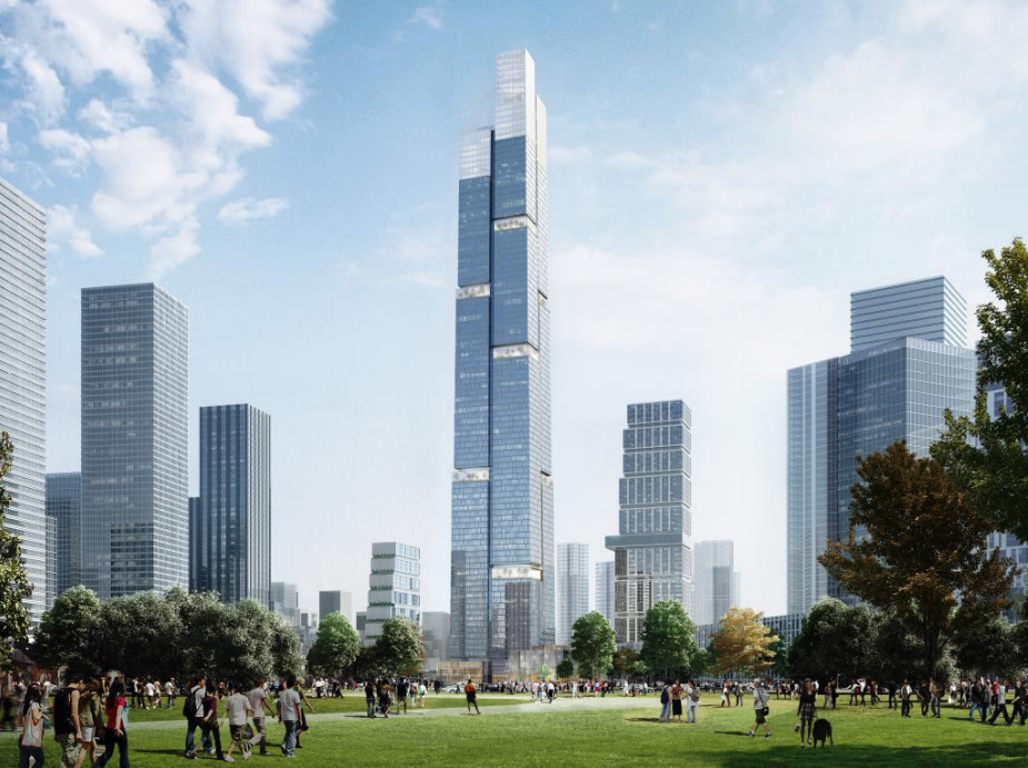 其中,主塔1-88层为办公,包含避难、设备及局部商业;89-95层为商业、观光。与之前公布的效果图一致,主塔由四个部分构成,且高度不一,分别为:89层(高约427.6米)、92层(高约443.6米)、95层(高约489米)。另外,旁边的2号楼还将分别打造下沉广场、酒店和商业。