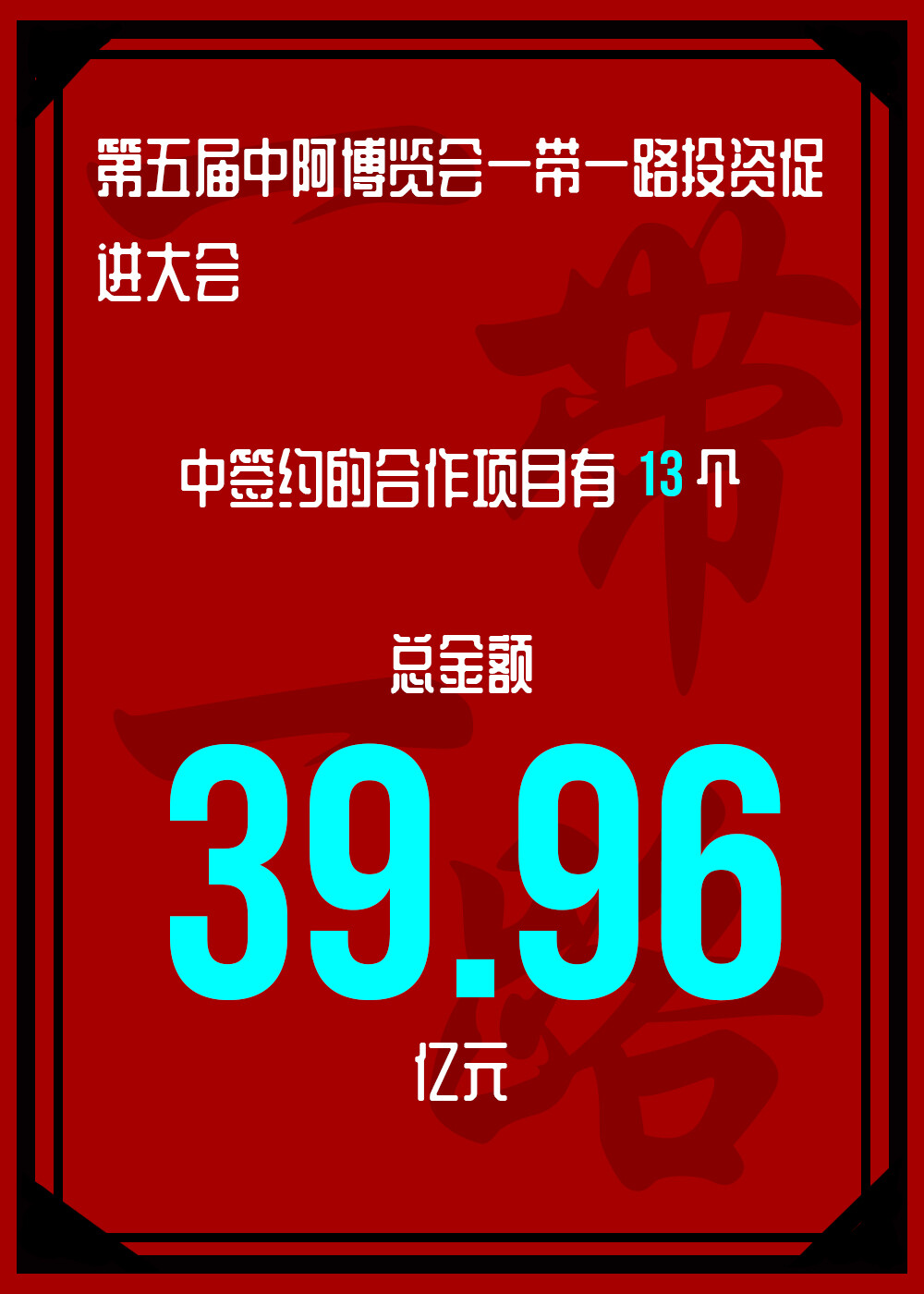 本次大会作为第五届中阿博览会的重要活动之一,是商务部和宁夏回族自治区政府共同举办的机制性会议,由中国对外承包工程商会、中国机电产品进出口商会、宁夏回族自治区商务厅共同承办。大会以“机遇·未来·可持续”为主题,聚焦积极共建一带一路建设、推动双向投资可持续发展。本次集中签约的合作项目有13个,总金额39.96亿元人民币。其中:境外投资项目2个、投资额6.33亿元人民币,境外承包工程项目3个、金额13.2亿元人民币,利用外资项目1个、投资额0.28亿元人民币,贸易合同项目4个、金额5.80亿元人民币,东西部合作项目2个、金额14.6亿元人民币,战略合作项目1个。项目涵盖了基础设施建设、新能源、现代农业、装备制造、生物医药、通用航空等领域。