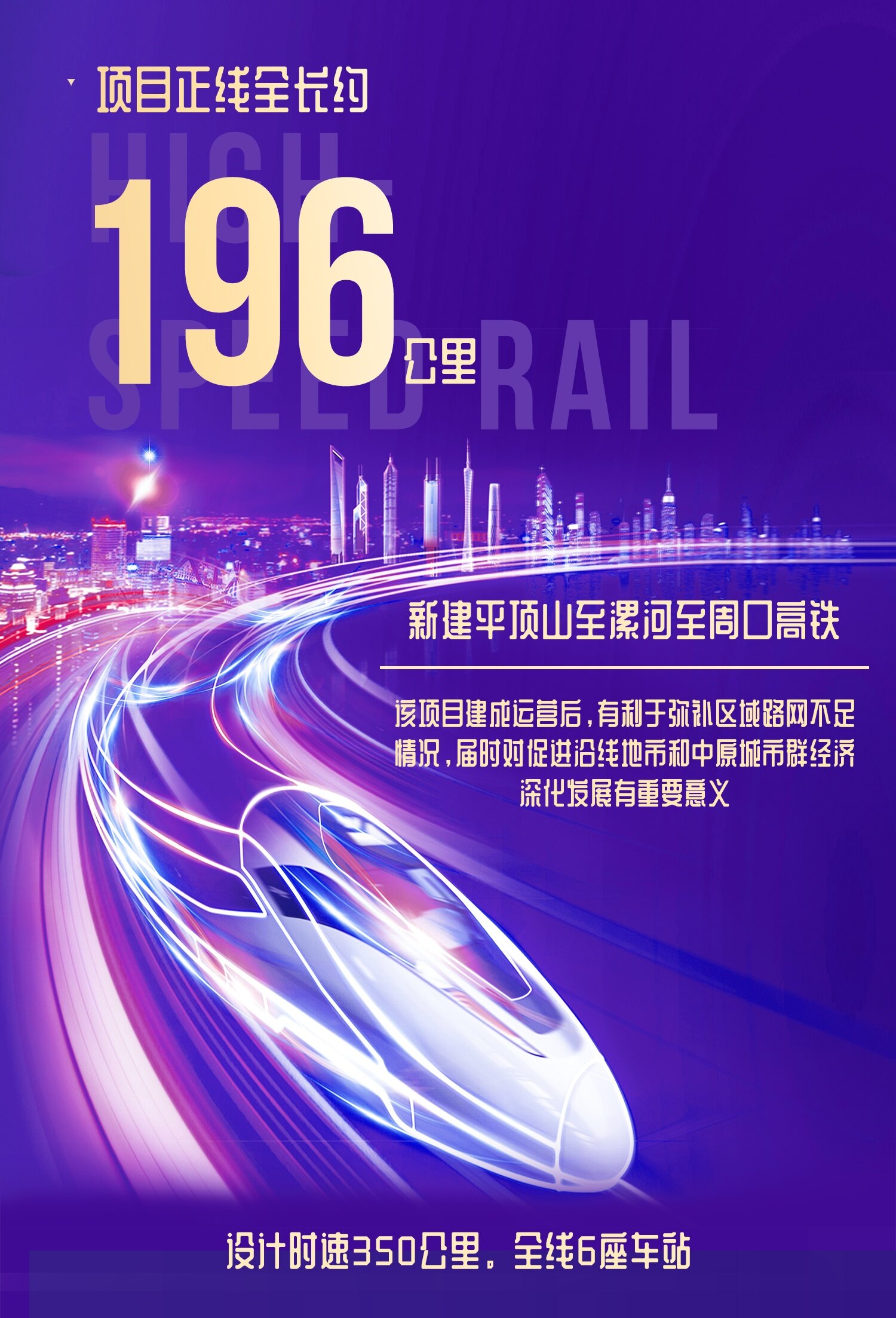 根据预可研方案,项目正线全长约196公里,联络线长约11公里(单线),设计时速350公里。全线拟设平顶山西、平顶山南、舞阳北、漯河西、周口西、周口东6座车站,其中利用既有站3座(平顶山西、漯河西、周口东)。
