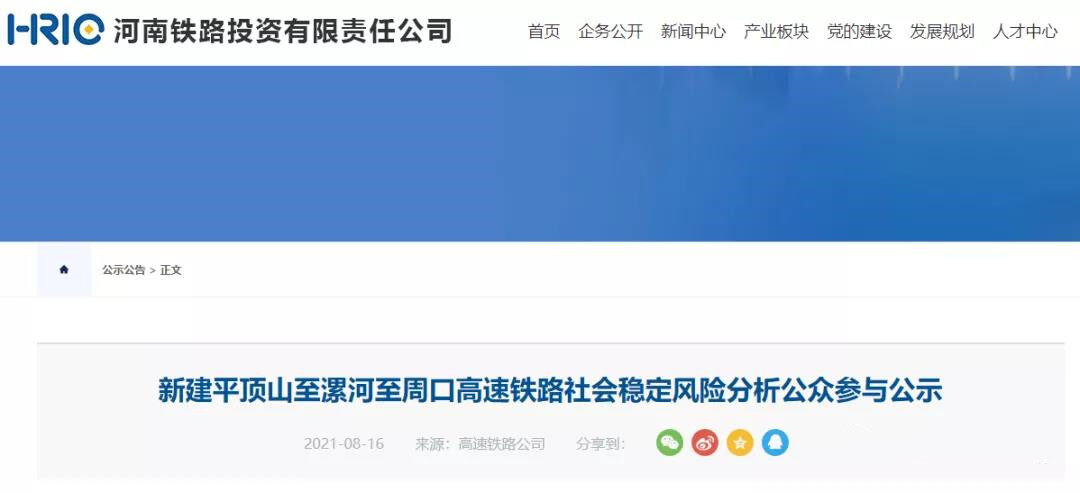 2021年8月16日,河南铁路投资有限责任公司发布了《新建平顶山至漯河至周口高速铁路社会稳定风险分析公众参与公示》,这标志着平漯周高铁前期工作取得重大进展。据悉,该项目已于6月初完成预可研评审,进入可行性研究阶段。