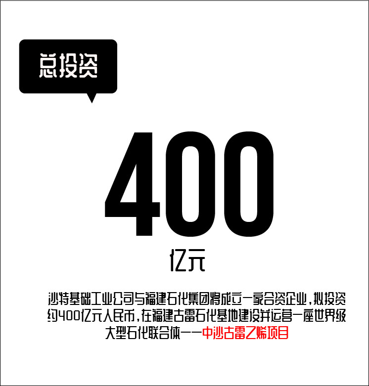 根据合同,沙特基础工业公司与福建石化集团将成立一家合资企业,拟投资约400亿元人民币,在福建古雷石化基地建设并运营一座世界级大型石化联合体——中沙古雷乙烯项目。该项目将建设一套年产150万吨乙烯装置,同时配套建设一系列下游生产装置,采用多项全球先进技术,具有装置规模大、经济效益好、高端产品多、能耗排放少、下游带动强等特点。
