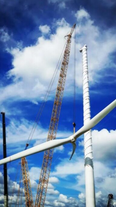 在吊装过程中,基于当地多雷雨、高温度等恶劣天气,项目人员通过提前预测天气将准备工作前置,从而保护电器设备免受雨水侵蚀,提升了吊装速度。在此过程中,由于越南当地人员吊装经验不足,明阳智能项目人员与客户、参建供应商积极沟通,协同作战,最终首台机组顺利吊装。