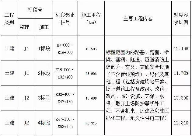 本项目施工总承包招标范围包括全线的路基、路面、桥梁、涵洞、隧道、隧道消防土建部分、交叉、交通安全设施(不含管线预埋)、绿化及其他工程(包括房建场地平整、场坪道路工程及改河、改路、改沟、临时设施、环保、水保、取弃土场防护等线外工程,不含机电、房建及房建区绿化工程、永久性供电工程),本次招标工程共分为4个标段。其类别划分、工程内容等见下表。
