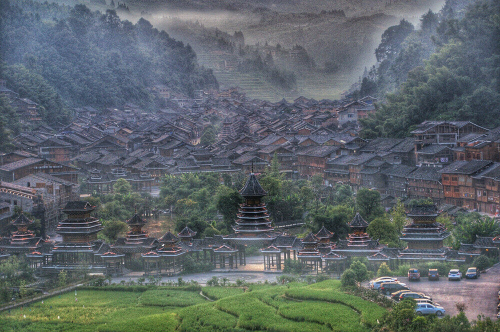 黔东南的崇山峻岭间,古老而神秘的侗族村寨隐居于此。山间有溪流穿寨而过,三五妇女临溪浣衣,棒槌敲打着青蓝色的侗布发出梆梆的声响,高低错落的梯田绿意盎然,牧牛人行走其间。木墙黑瓦的鼓楼、炊烟袅袅的吊脚楼鳞次栉比,禾仓、碾房、井亭、古桥在深山白云间错落有致,宛如一幅精细描摹的工笔画。