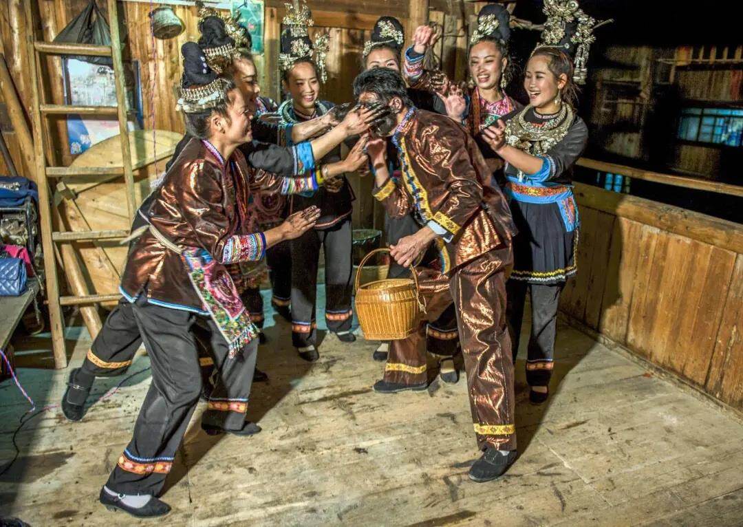 在女子家门口,将卣卣丢进屋内,侗家女子则取了糖果,将乌米饭装进卣卣,以表礼尚往来之意。此时,屋内的气氛顿时变得紧张刺激起来,进屋取乌米饭的人将会受到一轮“抹黑”,女子及其同伴事先准备好黑色锅烟灰,趁其不备,将锅烟灰尽情抹在小伙的脸上,谁的脸最黑,则代表谁最受欢迎。深居山林的肇兴侗寨,此时沉浸在谷雨时节的狂欢与喜庆之中。