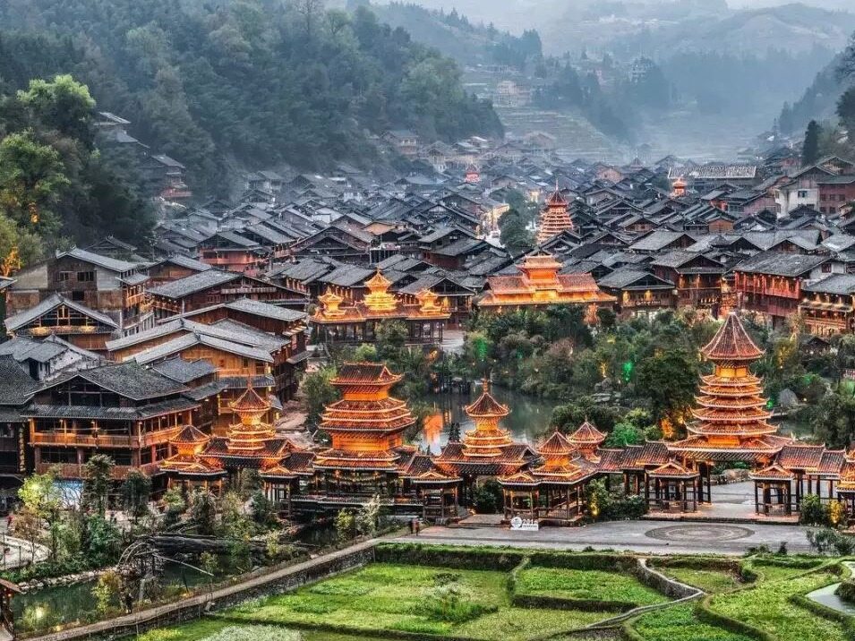 肇兴侗寨,位于贵州省黔东南苗族侗族自治州黎平县东南部,是中国最大的侗族村寨之一,素有侗乡第一寨之美誉。鼓楼、风雨桥、侗族大歌是侗族三宝,肇兴侗寨则以鼓楼群最为出名,曾载入吉尼斯世界纪录,被誉为鼓楼文化艺术之乡。每临节庆,侗族人呼朋唤友,盛装出席,欢聚鼓楼,踩歌堂,抬官人,齐唱大歌,芦笙悠扬。