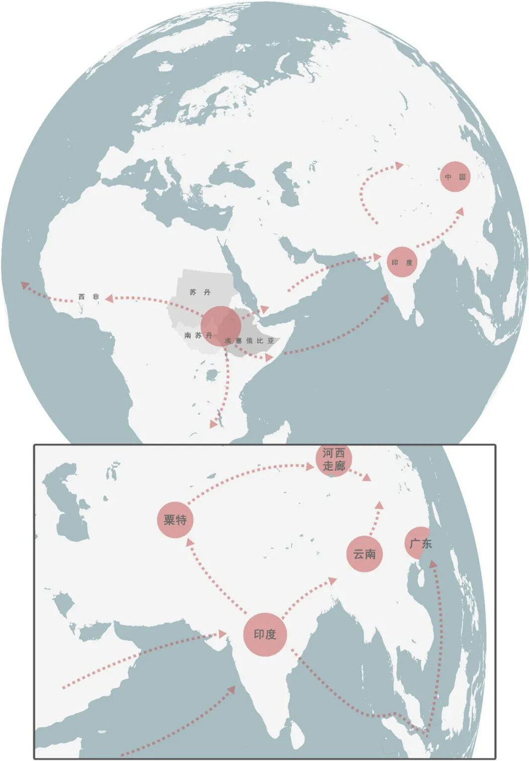 至于高粱如何由印度传入中国,那就是又一段颇有传奇色彩的风雨历程了。根据已有的考古发现来看,高粱大致在两汉魏晋时期传入中国,该时期的考古遗址中有十一处发现了高粱出土的痕迹,它们分别位于辽宁、内蒙古、山西、广东、江苏、陕西及河南等省份。但是,它们很有可能并不是从同一个方向传入中国。