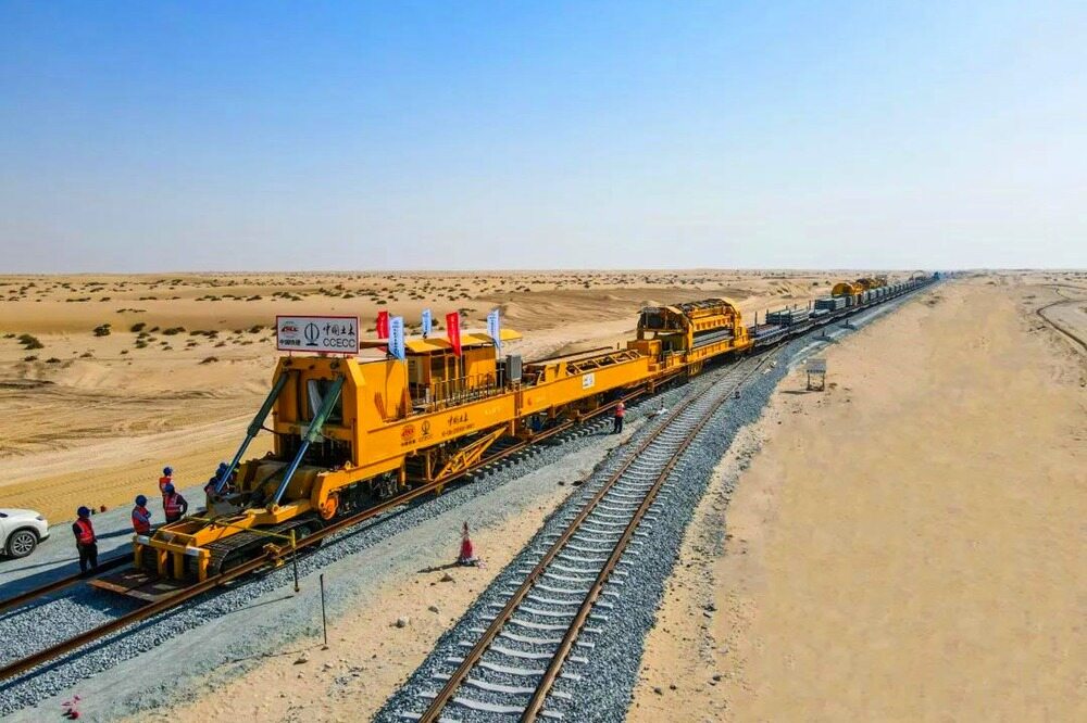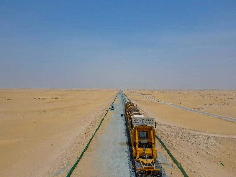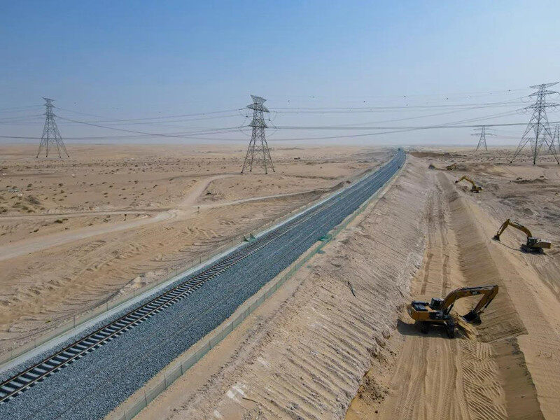 2021年9月1日,随着一根根标准轨枕平稳铺设在已预设的路基上,中国土木阿联酋铁路二期项目阿布扎比境内完成正线轨道铺设100公里。