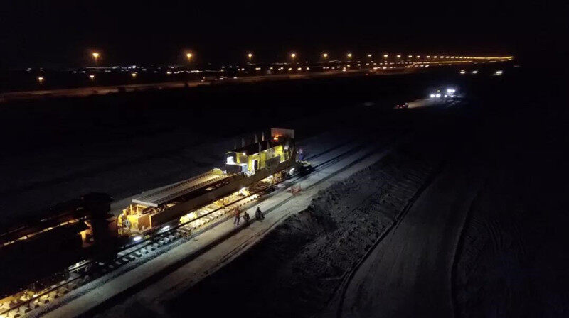 为了确保铺轨工期,轨道部夜以继日。因阿联酋夏季日间最高温度近50摄氏度,夜间施工便成为了阿联酋瀚海大漠中一道亮丽的风景线。夜晚,轨道铺到哪里,哪里就有近百米的灯光照亮沉睡中的沙漠,一条钢铁长龙游弋在正线路基之上,吞吐着轨枕与钢轨。单元轨节焊接、机械化上砟养路、单元轨节放散锁定等,一道道工序有序衔接,施工现场一翻紧张、忙碌的景象。