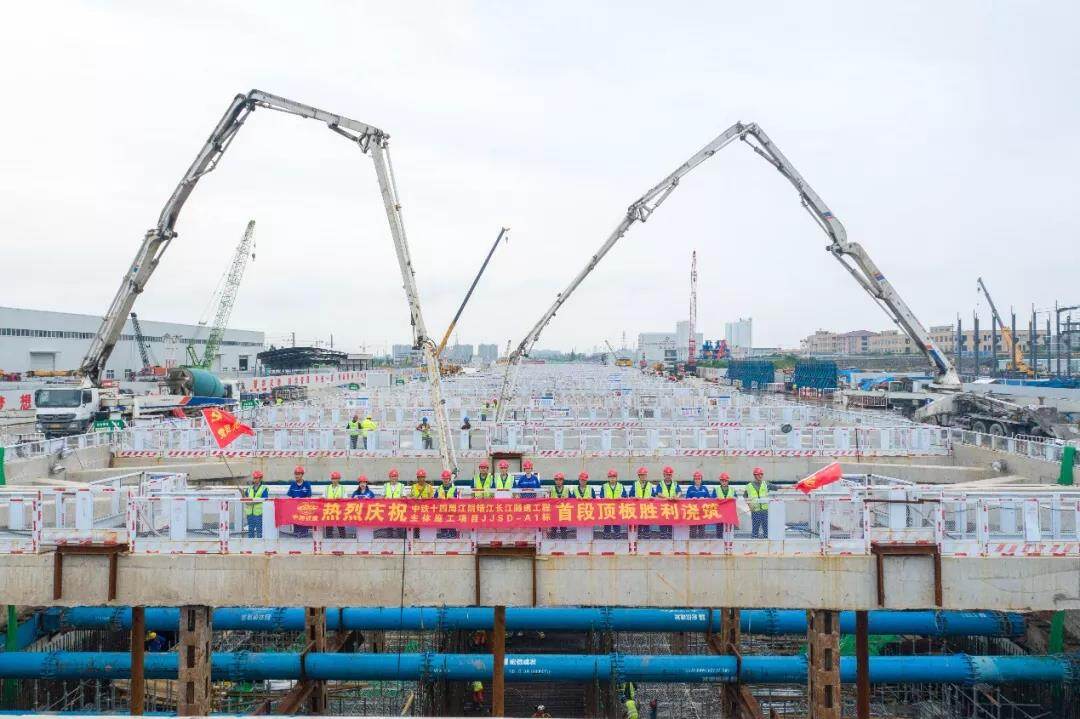 During the pouring construction, management personnel at all levels stood by to supervise the whole process of concrete mixing, transportation, pouring, and vibrating. The on-site construction work team closely cooperated, and the project carried out various operation procedures in an orderly manner. The smooth pouring of the roof of the first section of the Jingjiang Yangtze River Tunnel in Jiangyin marks a new stage in the construction of the main structure of the tunnel, laying a solid foundation for the subsequent section capping and shield machine launch.