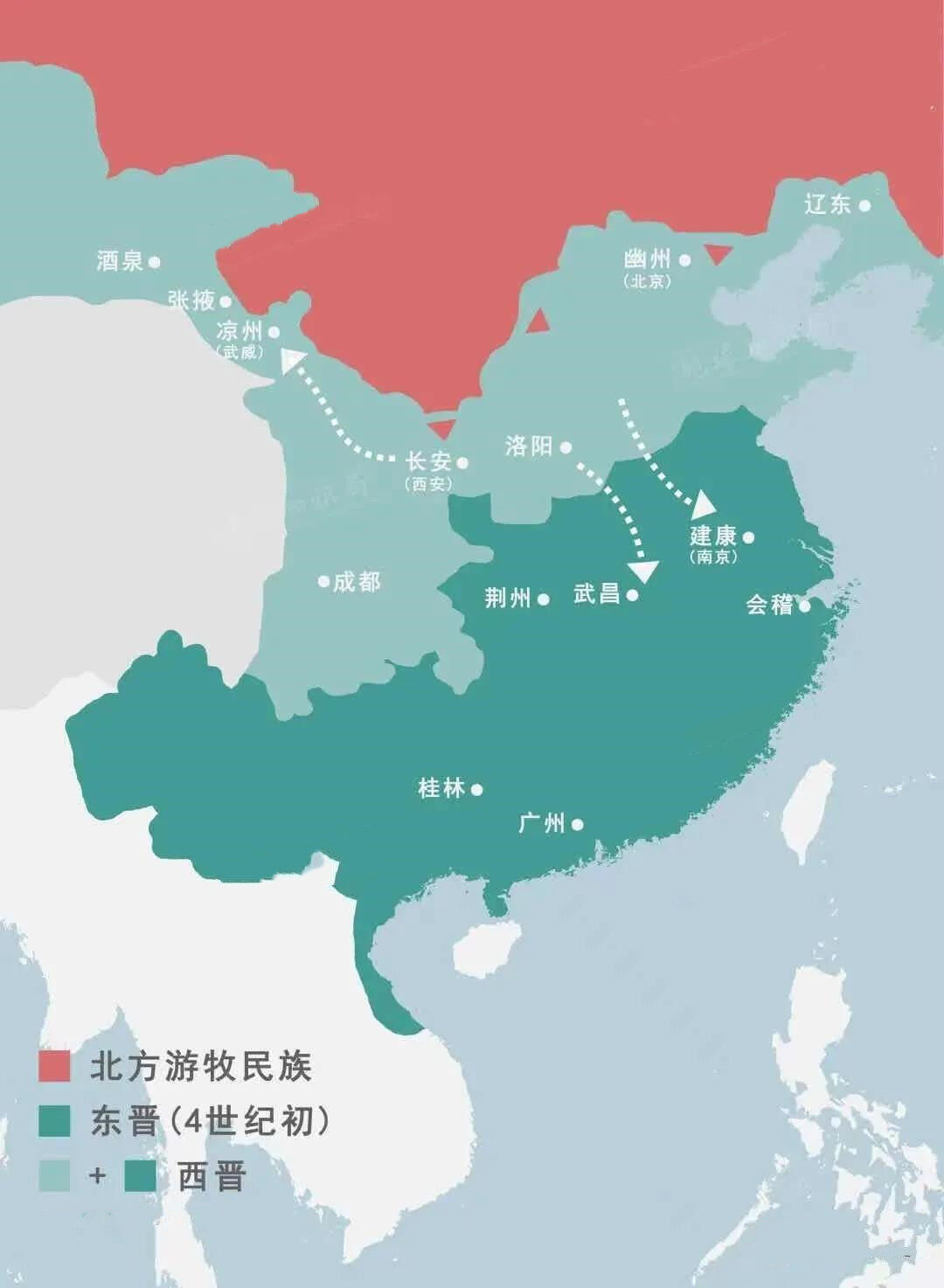 魏晋动乱之际,世家大族除了衣冠南渡迁往江南外,不少人迁徙到开发已有300余年的河西走廊。张轨经营的河西前凉政权境内,农耕、畜牧与商贸发达,是躲避战乱的理想之地。