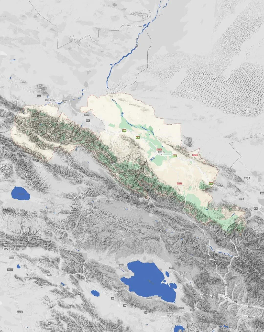 张掖在古代有时也被称为甘州,位于青藏高原和蒙古高原交汇的河西走廊中部。张掖的地理位置最能诠释河西走廊的走廊地形特征,它的东北面是龙首山和巴丹吉林沙漠,西南面是祁连山脉,都是人类较难穿越的复杂地形区,而黑河横亘其间的张掖绿洲,则在这两个地形板块间形成了一条相对狭窄的走廊地形。